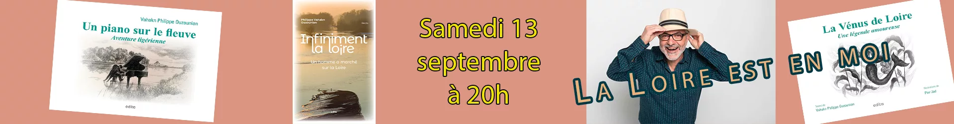 Philippe Ouzounian nous accueille pour une soirée lectures, contes, et récits, au travers de ses trois livres : INFINIMENT LA LOIRE, LA VÉNUS DE LOIRE, UN PIANO SUR LE FLEUVE