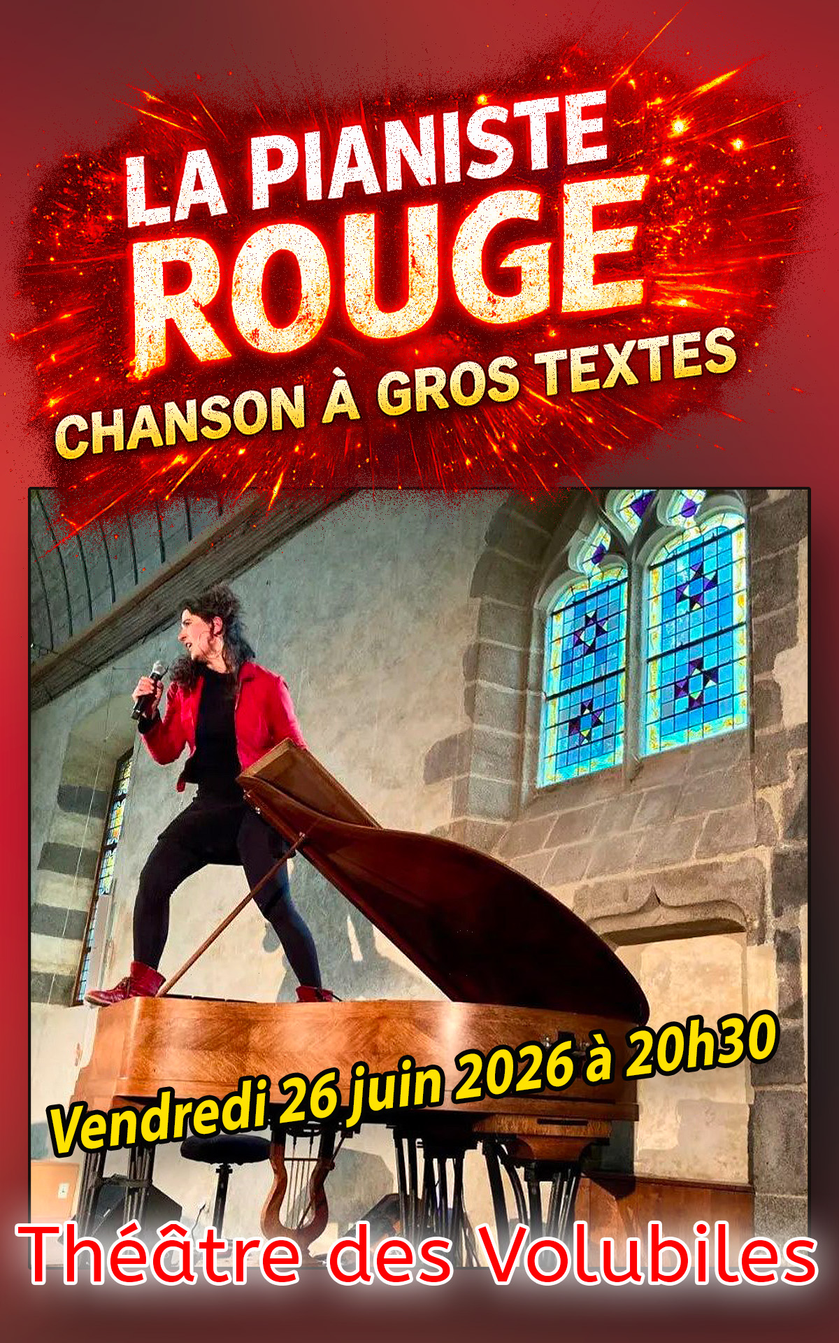 La Pianiste Rouge, c’est une présence. Une robe écarlate. Un piano sur roues. Une voix qui ose.